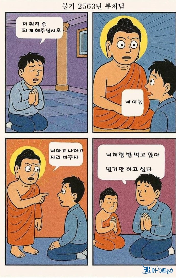 한 청년이 간절히 기도한다. “취직 좀 되게 해주십시오.” 현실의 무게에 눌린 청년의 목소리는 오늘날 수많은 이들의 삶을 대변한다. 그러나 부처님의 대답은 예상 밖이다. “네 이놈.” 꾸짖음으로 시작된 말씀은 단순한 위로가 아니라, 삶을 바로잡으라는 강한 일침이었다.