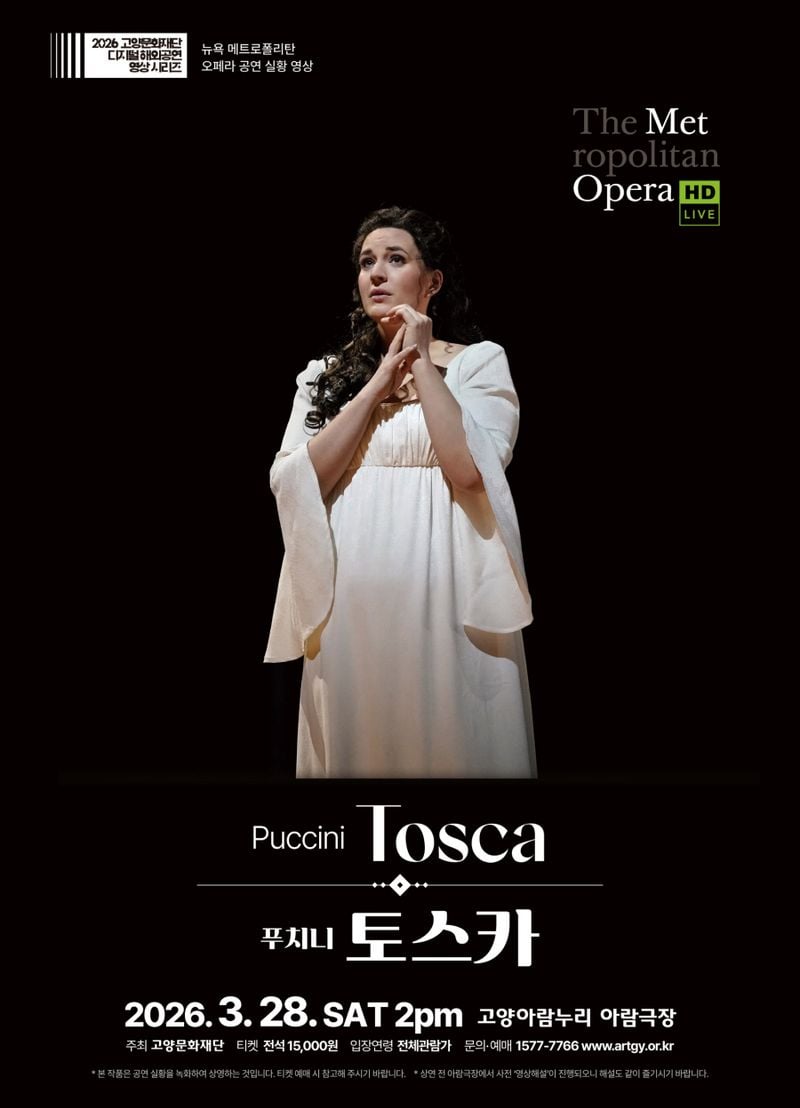 [음악=코리아아트뉴스 이청강 기자] 고양문화재단(이사장 이동환 대표이사 남현)은 오는 3월 28일과 29일 고양아람누리 아람극장에서 세계 최고 권위의 오페라극장인 미국 뉴욕 메트로폴리탄 오페라(The Metropolitan Opera)의 ‘토스카(Tosca)’와 ‘피가로의 결혼(Le Nozze di Figaro)’을 상영한다.