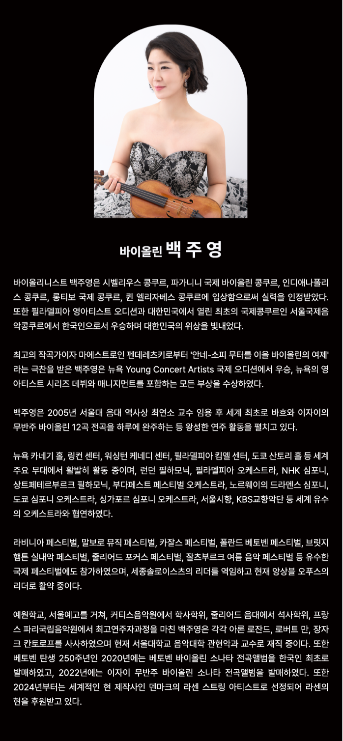 협연자로 참여하는 백주영은 국내외 무대에서 활발한 활동을 펼치고 있는 바이올리니스트로, 뛰어난 기교와 섬세한 음악성으로 높은 평가를 받고 있다. 그는 세계적인 오케스트라와의 협연을 비롯해 다양한 국제 무대에서 활약하며 한국을 대표하는 바이올리니스트 중 한 명으로 자리매김했다. 특히 베토벤 바이올린 협주곡은 백주영의 음악적 깊이와 서정적인 해석을 가장 잘 보여주는 작품 중 하나로, 이번 공연에서도 깊은 감동을 선사할 것으로 기대된다.