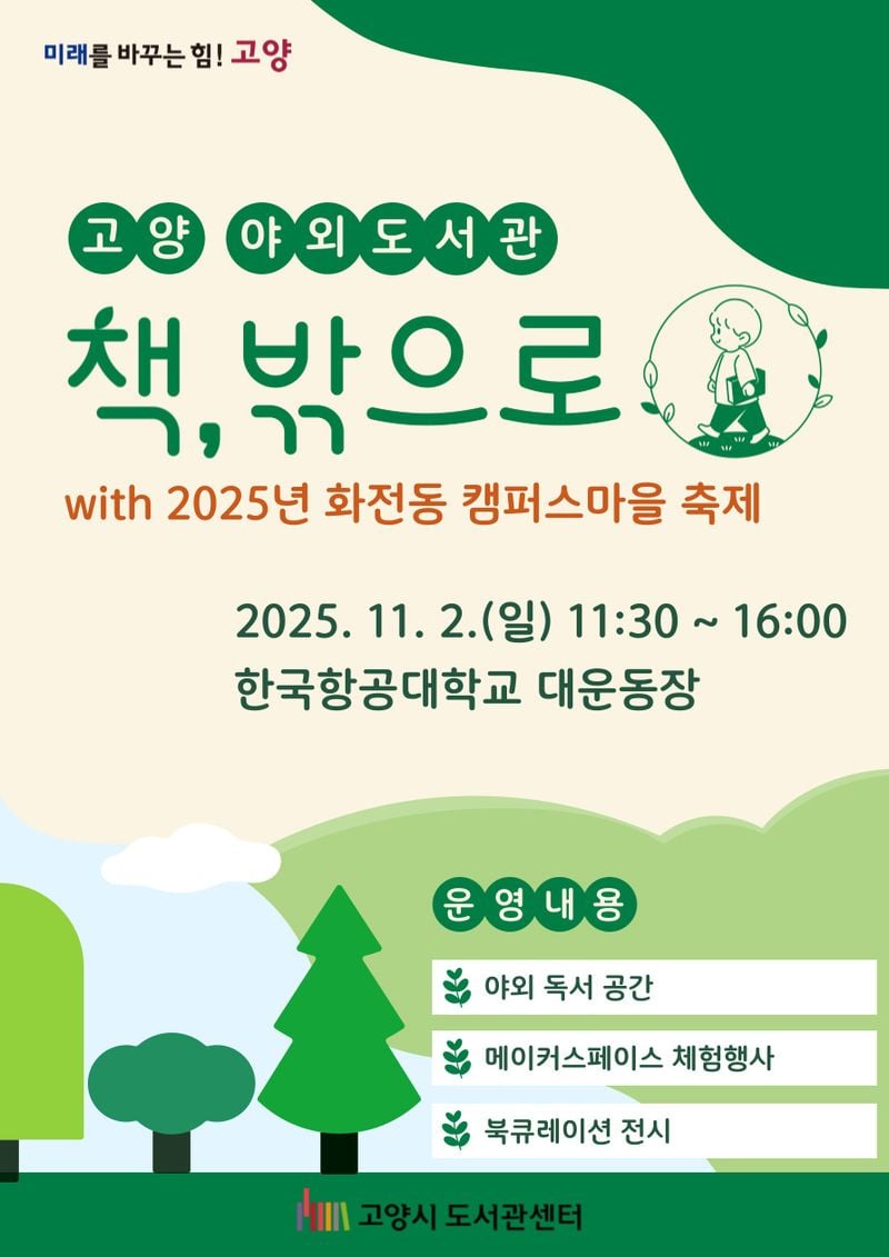 [고양=코리아아트뉴스 이청강 기자] 고양시 도서관센터는 오는 11월 2일(일) 오전 11시 30분부터 오후 4시까지, 한국항공대학교 대운동장에서 열리는 ‘화전동 캠퍼스 마을축제’현장에서 고양 야외도서관 ‘책, 밖으로’를 운영한다.