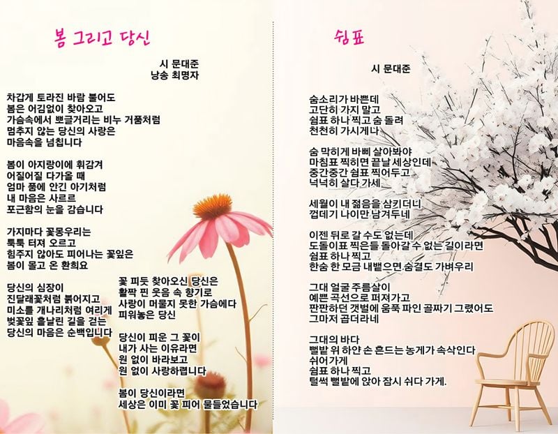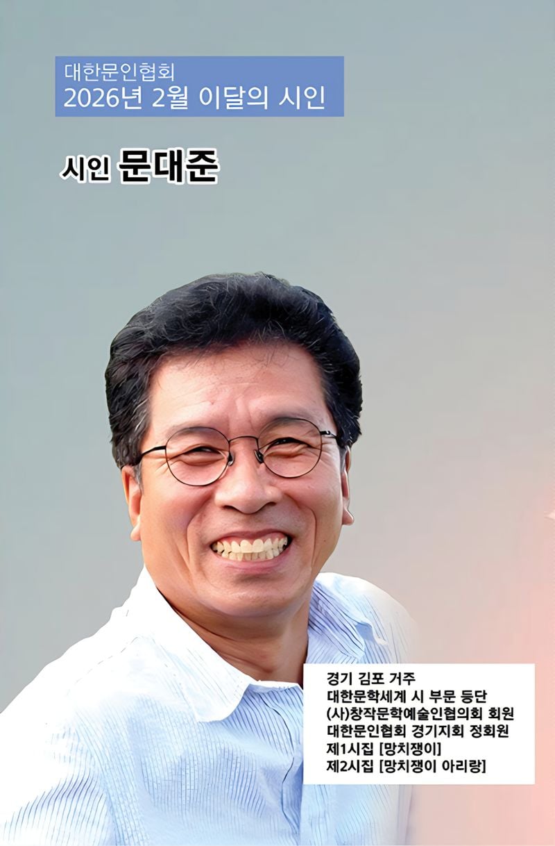 이어 문대준 시인의 대표작 '봄 그리고 당신' 작품과 '쉼표' 작품을 소개하며, 대한문인협회 2026년 2월 이달의 시인으로 선정했다.