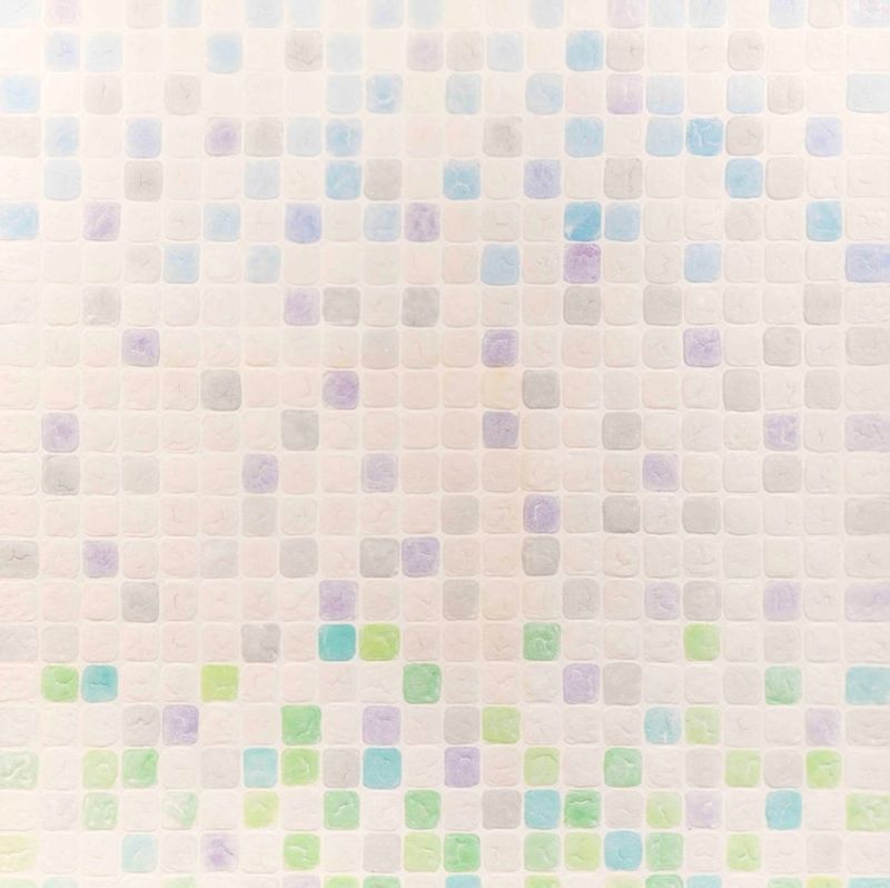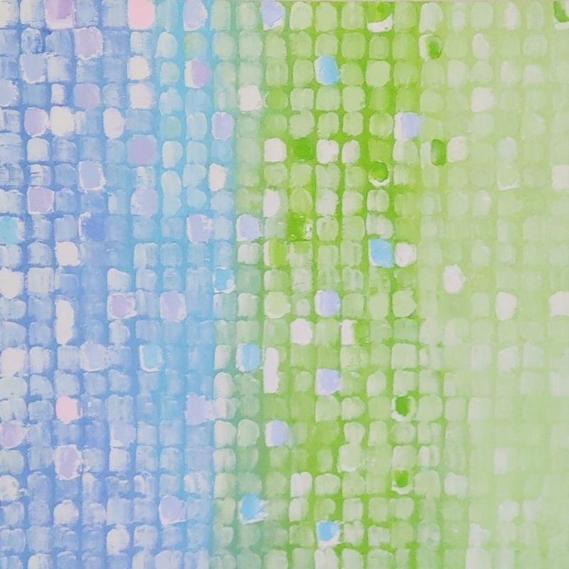 또한 <Deconstructed Grid- 자연, 삼월에 내리는 눈>은 삼월의 연두빛 새싹과 그 위에 함박눈으로 내리는 자연의 경이로운 아름다움을 표현했다. 복합재료를 붓으로 도톰하게 입체적으로 얹은 후 재료 본연의 물성을 이용하여 그리드에 자연스러운 크랙이 나게 유도했으며, 그리드 사이에 작은 여백을 주어 시각적으로 답답하지 않게 조율한 세심함이 돋보인다.