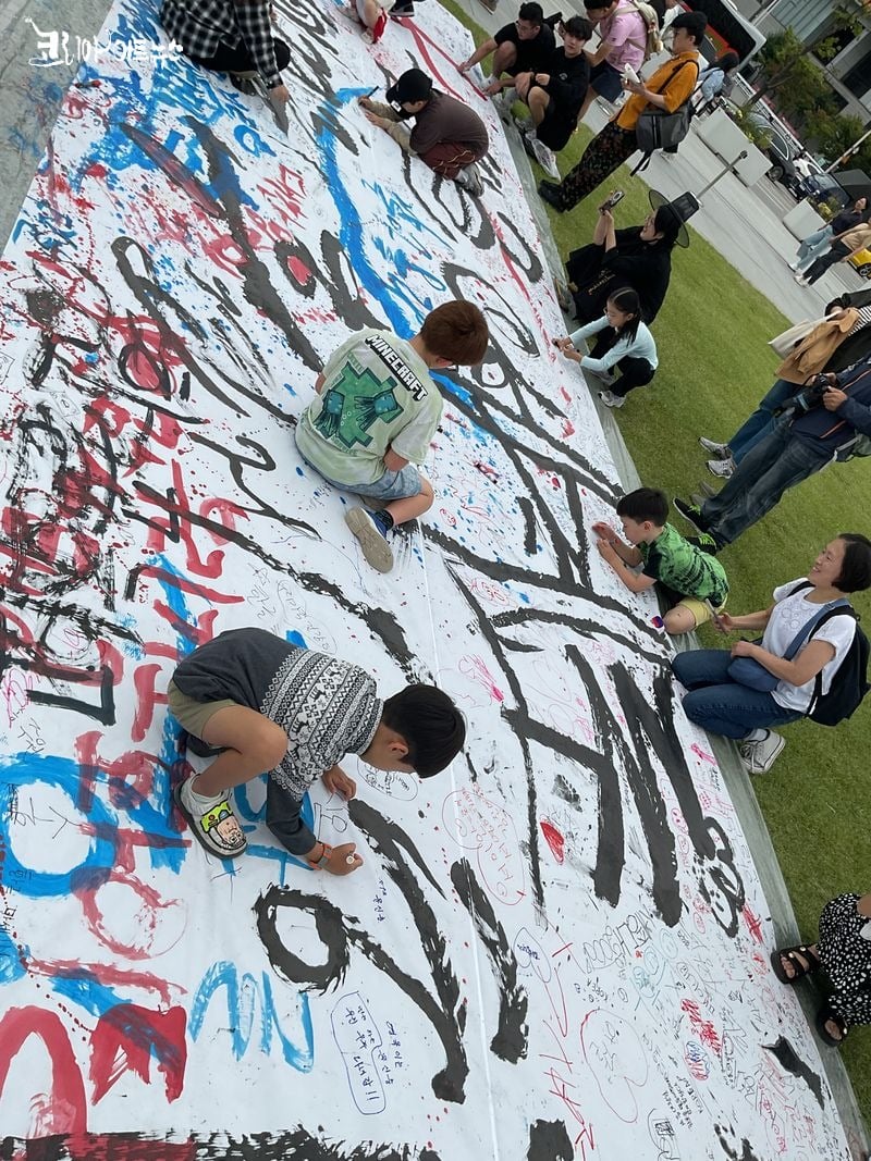 행사장에는 영화 <케데헌>의 전통 복장을 입은 캘리그라피 작가들이 등장해 눈길을 끌었다. 푸른 치마저고리 등 고전미를 살린 복장은 한글의 역사성과 예술성을 동시에 상징하며, 외국인들에게 깊은 인상을 남겼다. 외국인 관람객들은 작가들과 함께 ‘한글 사랑해요’, ‘훈민정음은 예술입니다’ 등의 문구를 직접 써보며 캘리그라피 체험을 즐겼고, 그 결과물을 들고 작가들과 나란히 서서 기념촬영을 하며 한국 문화에 대한 애정을 표현했다.