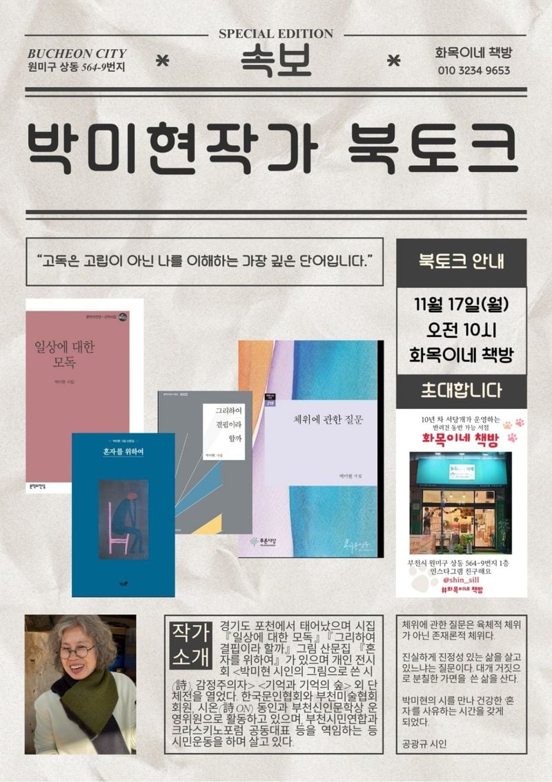 박미현 시인이 오는 11월 17일(월) 오전 10시, 부천시 원미구에 위치한 ‘화목이네 책방’에서 북토크를 진행한다. 이번 행사는 신실 대표의 제안으로 마련되었으며, 시인은 “말보다 글이 편한 사람”이라며 조심스러운 마음을 전하면서도 “할 수 있는 것에 감사하며 소소하게 해보려 한다”고 밝혔다.