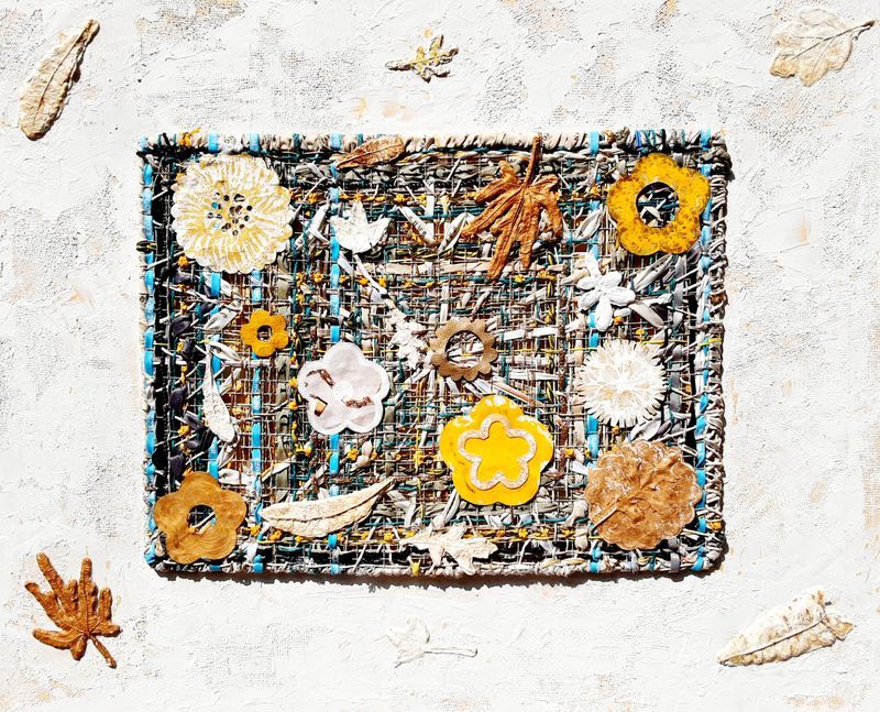 이번 출품작들에서는 김혜란 작가 특유의 감각적 조형미가 두드러진다. 푸른 바탕 위에 꽃과 잎, 원형의 생명 이미지를 리듬감 있게 배치한 작품은 마치 이상적인 정원을 내려다보는 듯한 인상을 주며, 화면 전체에 맑고 청량한 생명감을 불어넣는다. 또 다른 작품들에서는 직조적 구조와 오브제적 요소를 결합해 자연과 시간, 기억의 층위를 입체적으로 구성하면서 평면 회화와 부조의 경계를 넘나드는 실험성을 보여준다.