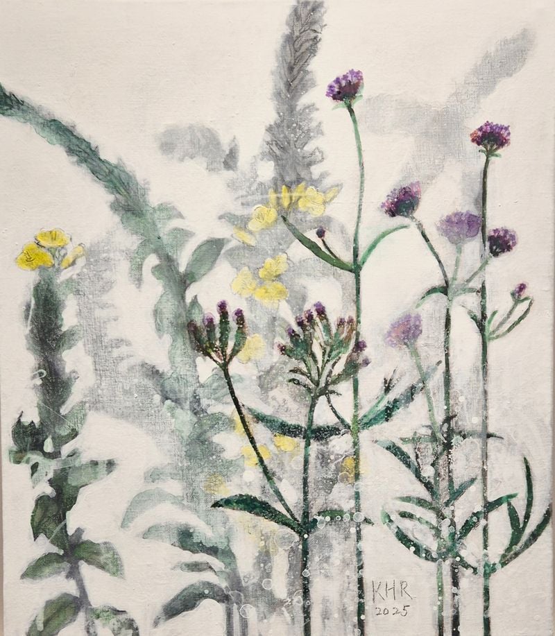 붉은색과 분홍색 계열의 화면에서는 보다 응축된 감정과 생명의 에너지가 강렬하게 드러난다. 화면 중심에 구축된 구조물과 그 주변을 감싸는 꽃과 잎의 흔적들은 내면 깊숙한 곳에 자리한 상처와 회복의 시간을 상징적으로 드러내며, 삶의 밀도와 감정의 진폭을 압축적으로 전한다. 반면 섬세한 필치로 그려낸 야생화 연작에서는 절제된 색감과 여백 속에 자연의 고요한 숨결이 스며 있으며, 소박하지만 단단한 생명의 아름다움을 보여준다.