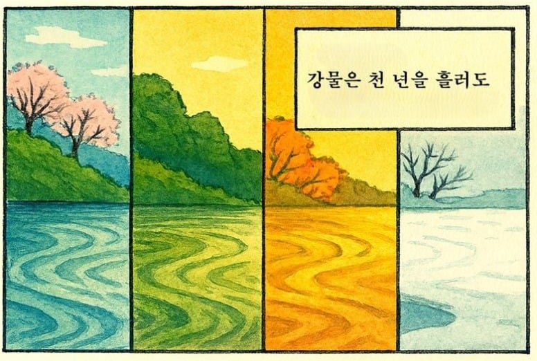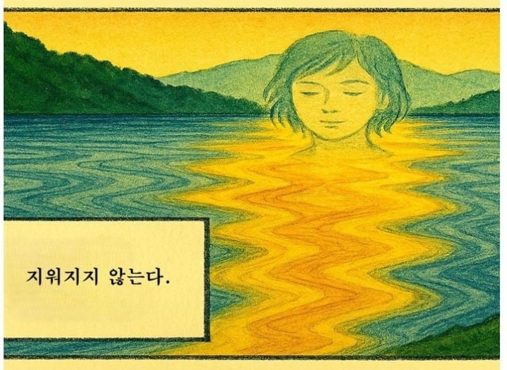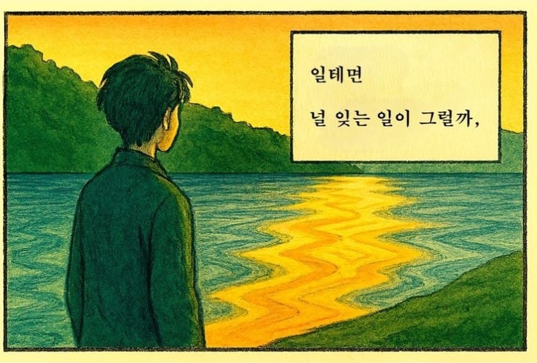 “강물이 천 년을 흘러도 산빛을 지우지 못한다”는 구절은, 시간의 흐름 속에서도 사라지지 않는 기억과 감정의 지속성을 암시한다. 이어지는 “널 잊는 일이 그럴까”라는 회상은, 시적 화자의 내면에 자리한 존재의 흔적이 얼마나 깊고 오래 남아 있는지를 보여준다.