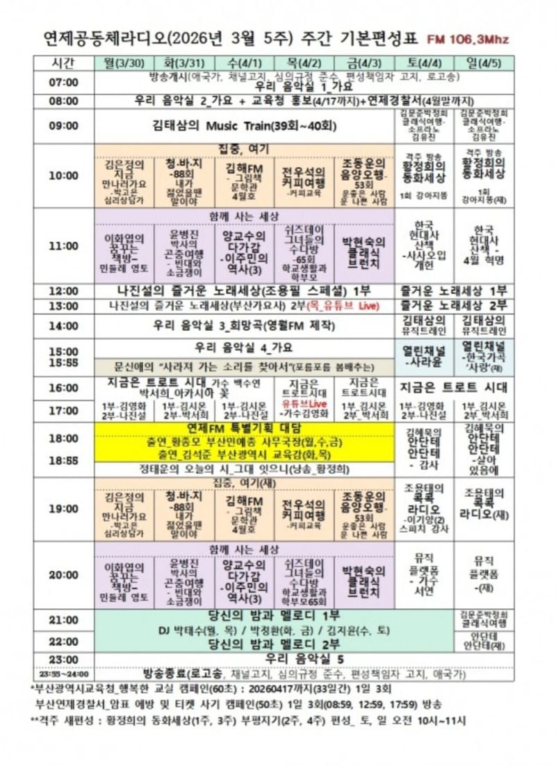 [문화예술=코리아아트뉴스 이청강 기자] 주파수 FM 106.3Mhz 부산지역 대표 라디오 방송인 연제공동체라디오(우리FM) "황정희의 동화세상" 1회 '강아지똥' 방송(지난 4월 4일 오전 10시 본방/ 5일 오전 10시 재방)이 송출되었다.
