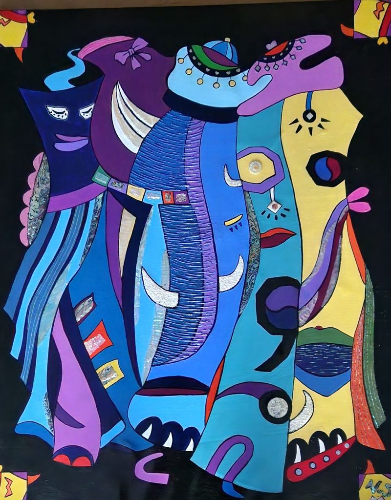 작가노트에 따르면, ‘춤추는 코끼리’는 각 가정이 지닌 특성과 성격, 취향, 그리고 저마다의 색상을 하나의 화면 안에 조화롭게 배열함으로써 가족의 화목과 기쁨, 즐거움을 시각적으로 구현한 작업이다. 서로 다른 색과 형태가 충돌하기보다 어우러지는 화면 구성은 “가족의 융화와 단결”이라는 메시지를 더욱 선명하게 한다.