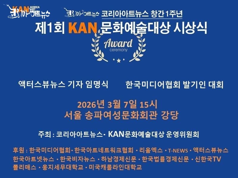 특히 창간 1주년을 맞아 한국 예술 발전을 위해 노력하는 작가와 공로자를 찾아 제1회 KAN문화예술대상을 제정하고 오는 3월 7일 뜻깊은 시상식을 열게 되어 매우 기쁘게 생각합니다.