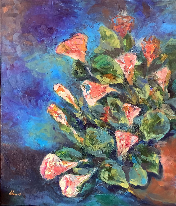 「Petunia」는 저녁 어스름 속에서 쓸쓸하면서도 신비로운 빛 사이에 조용히 피어난 페튜니아를 담아낸 작품이다. 작가는 낮의 빛이 사라지는 순간에도 꽃은 자신의 색을 잃지 않고 작은 빛으로 남아 있다고 말한다. 이 작품은 화려하게 피어오르는 꽃의 생명력을 강조하기보다, 사라지는 빛 속에서도 끝까지 자신을 지켜내는 존재의 아름다움에 주목한다. 화면 속 꽃들은 어둑한 배경 위에서 더욱 선명하게 떠오르며, 마치 하루의 끝에서 건네는 조용한 위로처럼 다가온다.