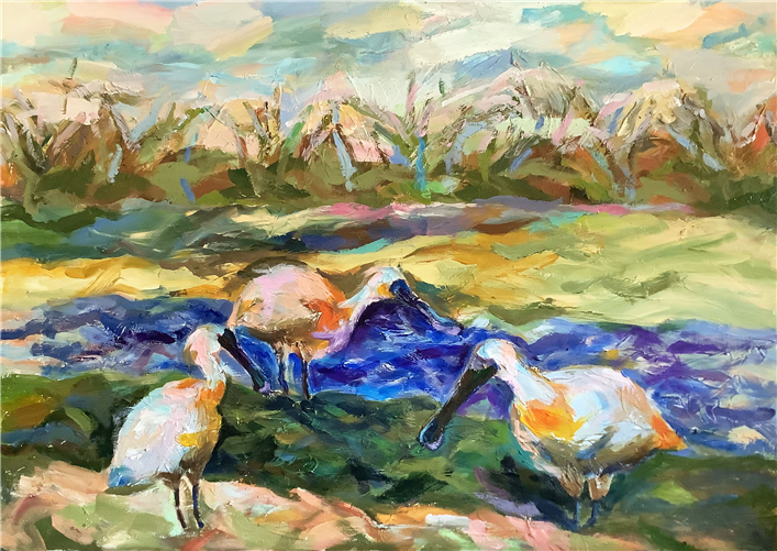 그림 속 저어새는 단순한 새가 아니라, 사라져가는 생태의 징후이자 기억의 상징으로 자리한다. 박순환 작가는 멸종위기 저어새의 이미지를 의도적으로 거칠고 강한 붓질로 표현해 자연의 위태로운 상태를 화면에 긴장감 있게 담아냈다. 동시에 밝고 강렬한 색채를 사용해 현실의 풍경과는 다소 이질적인 감각을 만들어냈는데, 이 대비는 오늘날 자연이 지닌 아름다움과 불안이 동시에 공존하고 있음을 은유한다. 보는 이로 하여금 단지 새를 감상하는 데 머무르지 않고, 생태계와 인간의 관계를 다시 생각하게 만드는 작품이다.