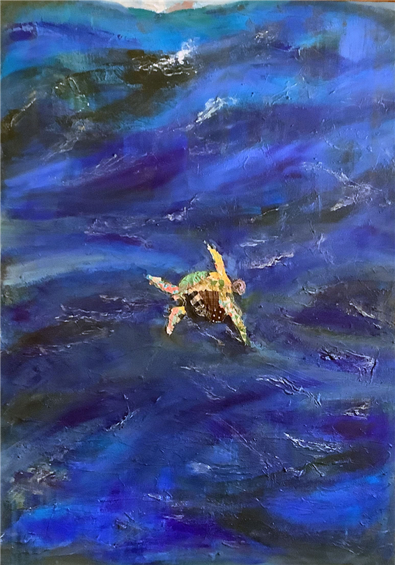 작가는 바다속의 불안정한 생명의 움직임에 주목했고, 불안한 거북이의 형상을 버려지는 천과 실을 사용해 구축했다고 설명한다. 버려지는 천의 구김과 겹침은 위태로운 생태의 감각을 상징적으로 드러내며, 단순한 재료의 재사용을 넘어 바다 생명의 연약함과 연결된다. 작품 속 물결은 거칠고 깊은 붓질로 표현되어 있고, 두터운 물감 층과 강한 움직임의 터치는 심해의 압도적인 공간감과 생명의 흐름을 동시에 전한다. 이 작품은 단지 환경문제를 고발하는 데 그치지 않는다. 오히려 한 생명이 거대한 자연 속에서 버티고 있는 순간을 통해, 우리 역시 이 위태로운 세계 안에 함께 놓여 있음을 환기한다.