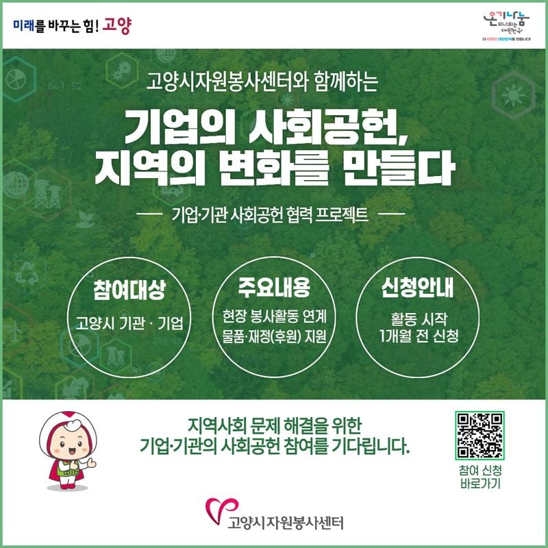 한편, 고양시자원봉사센터는 작년 총 13개 기업·기관과 협력해 489명의 임직원이 참여하는 사회공헌 활동을 추진했으며, 환경정화 및 생태 보호, 취약계층 지원 등 지역사회 문제해결을 위한 다양한 프로그램을 운영한 바 있다.