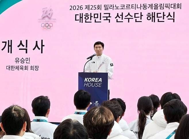 유승민 대한체육회장은 현지시간 22일 오전 10시 밀라노 코리아하우스에서 열린 2026 밀라노코르티나동계올림픽대회 대한민국 선수단 해단식에서 “밀라노코르티나동계올림픽이라는 세계적인 무대에서 태극기를 가슴에 달고 끝까지 최선을 다해 경기에 임한 선수 여러분께 깊이 감사드린다.”고 말했다.