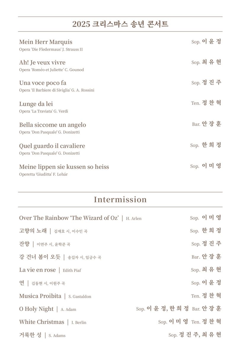 이번 송년 콘서트는 클래식 오페라 아리아부터 대중적인 크리스마스 캐롤까지 폭넓은 레퍼토리로 구성되어 관객들에게 감동과 즐거움을 동시에 선사한다. 공연은 두 파트로 나뉘어 진행되며, 각 성악가들의 개성과 기량이 돋보이는 무대가 펼쳐질 예정이다.