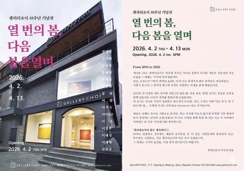 서울 마포구에 위치한 갤러리초이가 개관 10주년을 맞아 특별기획전 ‘열 번의 봄, 다음 봄을 열며’를 개최한다. 전시는 2026년 4월 2일부터 4월 13일까지 열리며, 오프닝 행사는 4월 2일 오후 5시 진행된다.