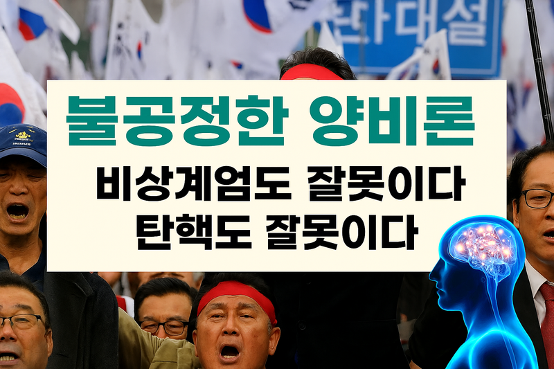 예를 들어 ‘비상계엄’도 잘못이지만, ‘탄핵’도 잘못이다. 라는 사고방식이 바로 노골적인 양비론이다. 일종의 물타기 수법이다. 이쪽도 저쪽도 별반 다를 게 없이 둘 다 같다는 식의 ‘양비론’의 글이나 말들은 논리의 싸움에서는 유용할지 모르지만, 결코 심각한 오류에 빠질 수밖에 없는 논리이다.