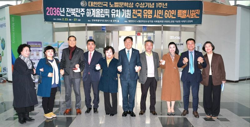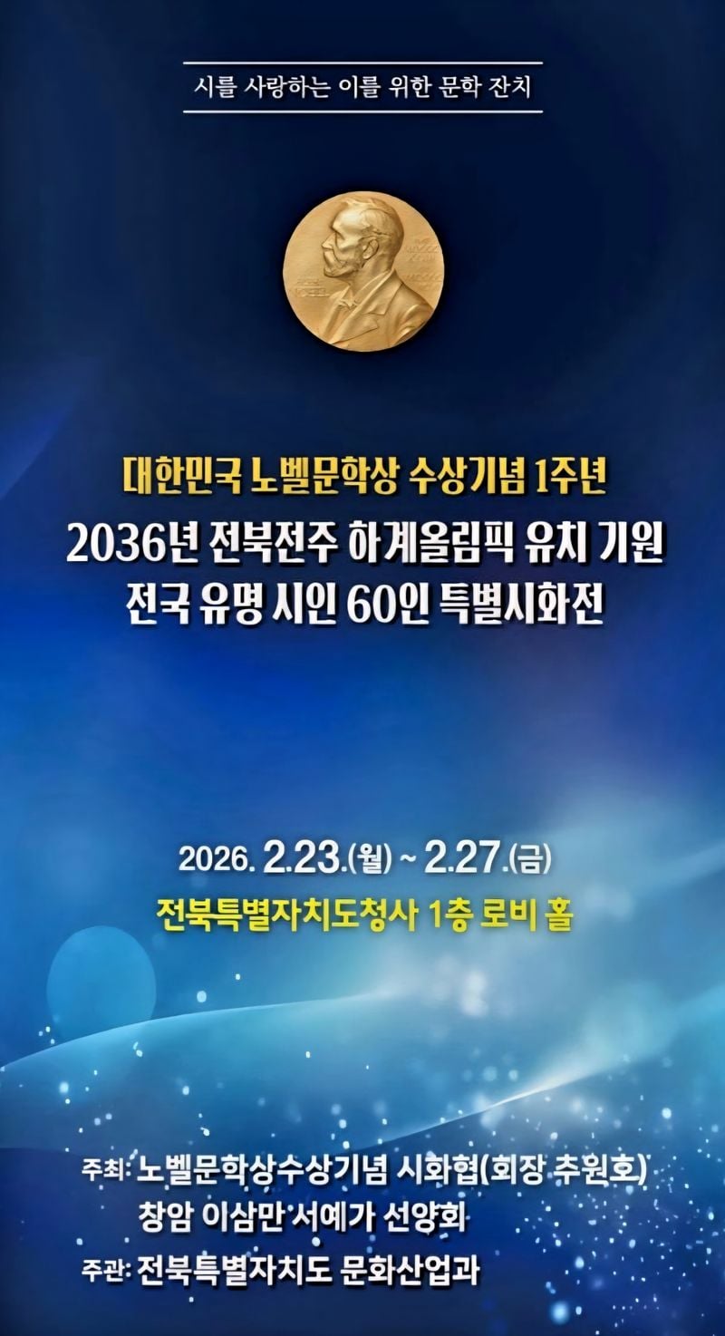 [문학=코리아아트뉴스 이청강 기자] 대한민국 노벨문학상 수상 1주년을 기념하는 전국 유명 시인 60인 특별시화전이 지난 2월23일 전북특별자치도청 1층 로비 홀에서 개막했다.