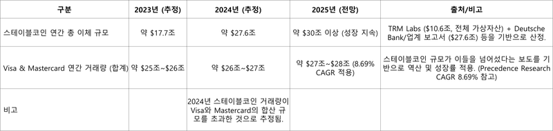 금융산업에 있어 스테이블 코인의 최대 강점은 법정화폐와 연동된 안정성과 빠른 결제 속도, 그리고 낮은 거래비용이다. 2024년 기준 스테이블 코인의 글로벌 송금 및 결제 총액은 약 27.6조 달러에 달하며, 이는 신용카드 거대사인 비자와 마스터카드 결제액을 합산한 금액보다 7.7% 큰 수치로, 지불 수단의 재편과 디지털 금융 인프라 혁신은 가속화되고 있다.