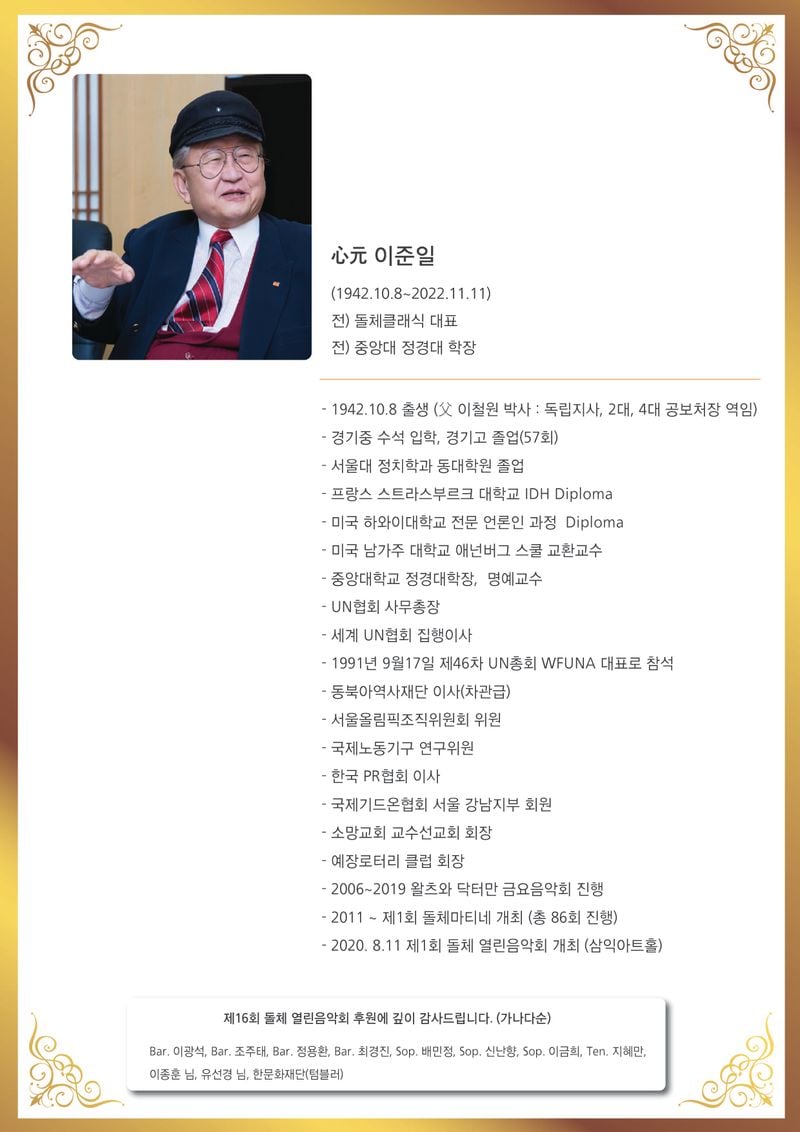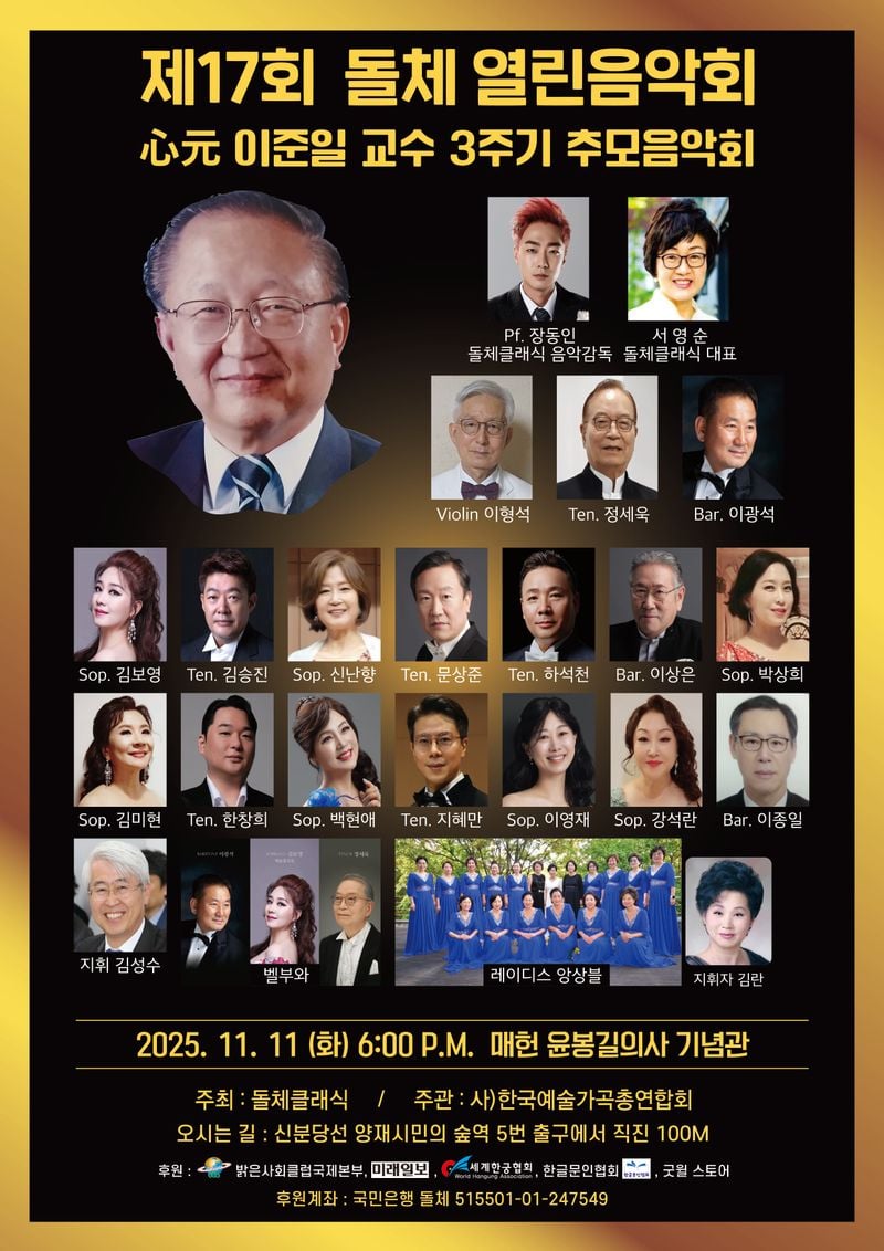 특히 이번 공연은 故 이준일 교수의 3주기를 기리는 추모음악회로, 그가 생전에 펼쳐온 예술적 비전과 나눔의 정신을 되새기는 데 중심을 둔다.