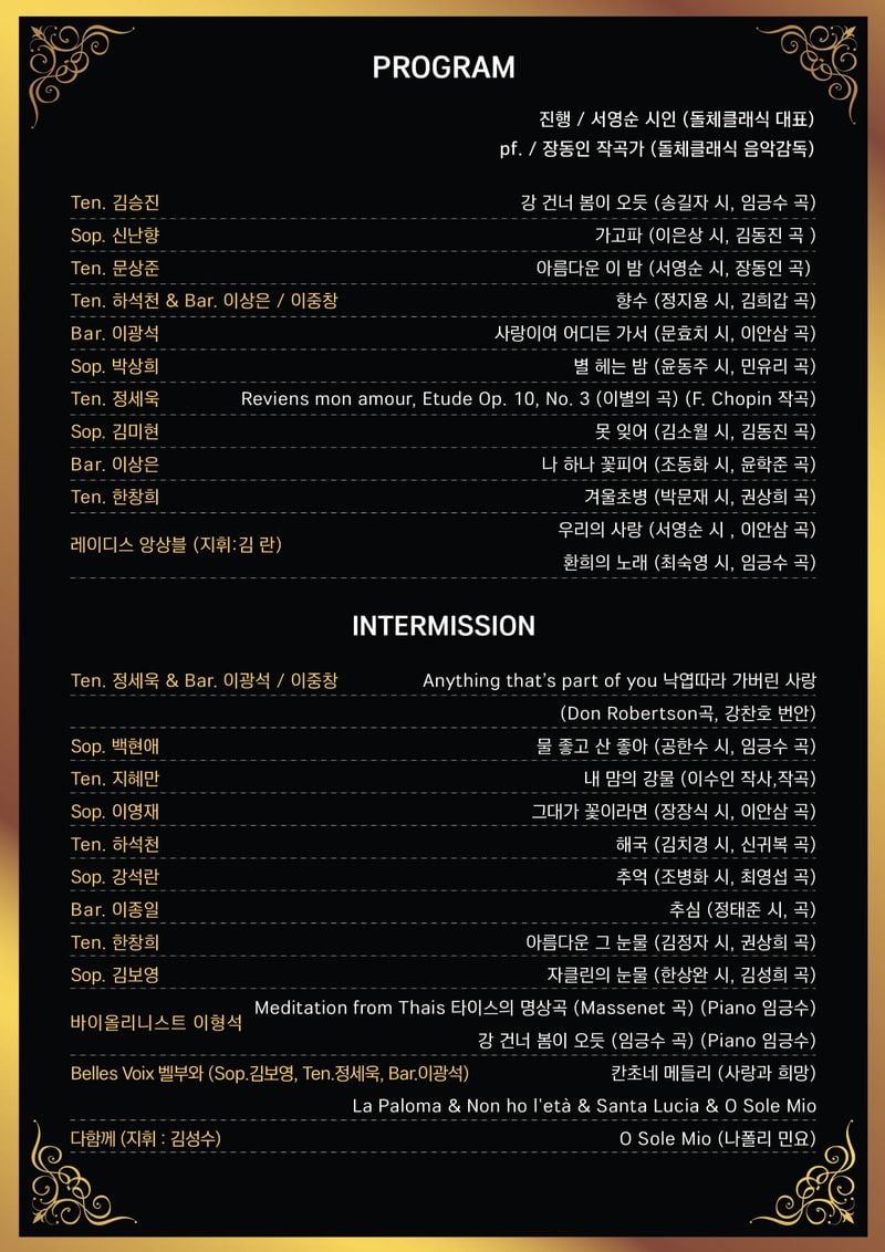 공연의 사회는 시인이자 돌체클래식 대표인 서영순이 맡아 감성적인 해설과 따뜻한 언어로 무대를 이끈다. 장동인 음악감독은 섬세하고 풍성한 피아노 반주로 전 연주를 조화롭게 이끌며 깊은 감동을 더할 예정이다.