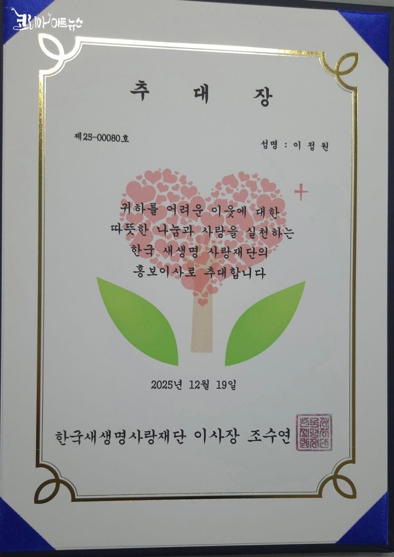 지난 12월 19일, 서울 종로구 소재 한국새생명사랑재단 사무국에서 본보 코리아아트뉴스 이청강 기자는 한국새생명사랑재단 조수연 이사장으로부터 한국새생명사랑재단 홍보이사로 추대되었다.