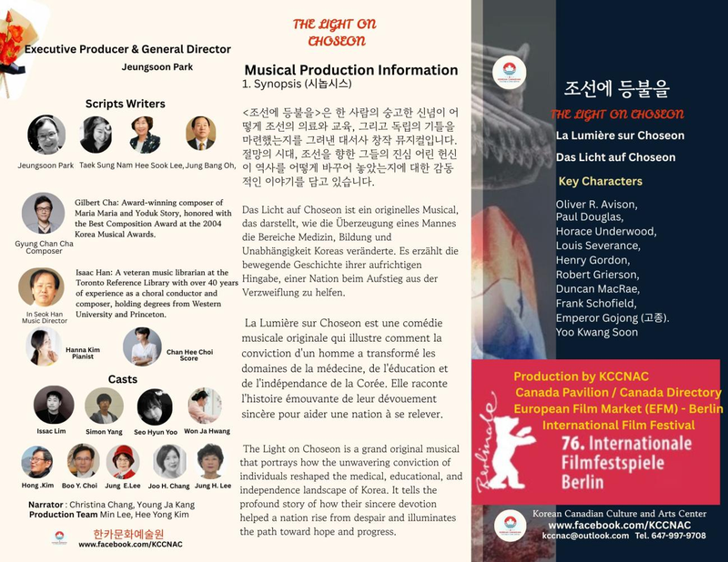 캐나다 오로노에 기반을 둔 한카문화예술원(KCCNAC)이 제작한 뮤지컬 <조선에 등불을(The Light on Choseon)>과 다큐멘터리 <머나먼 고향(Far from Home)>이 세계 3대 영화제 중 하나인 베를린 국제영화제(EFM) 캐나다 디렉터리에 공식 등재되는 쾌거를 이루었다.