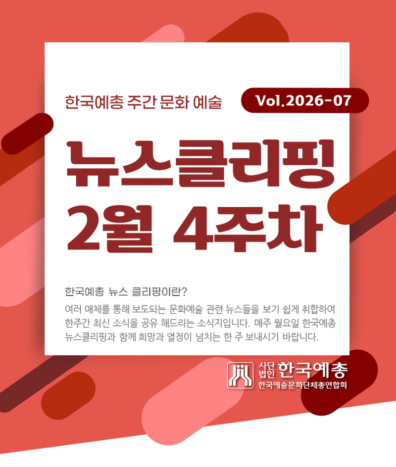한국아트넷뉴스가 한국예술문화단체총연합회(이하 한국예총) ‘공식파트너 인터넷신문’으로 등록된 이후, 첫 공식 성과로 한국예총 주간 콘텐츠인 ‘뉴스클리핑 2월 4주차(Vol.2026-07)’에 기사 내용이 처음 게재됐다.