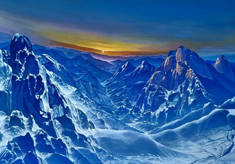 작가는 돌가루와 안료, 아크릴을 사용해 산의 질감을 입체적으로 표현했다. 거친 바위의 표면은 빛을 머금고, 그 속에 깃든 시간의 결을 드러낸다. 화면은 따뜻하면서도 냉정하며, 보는 이로 하여금 자연의 질서와 인간의 감정을 동시에 마주하게 한다.