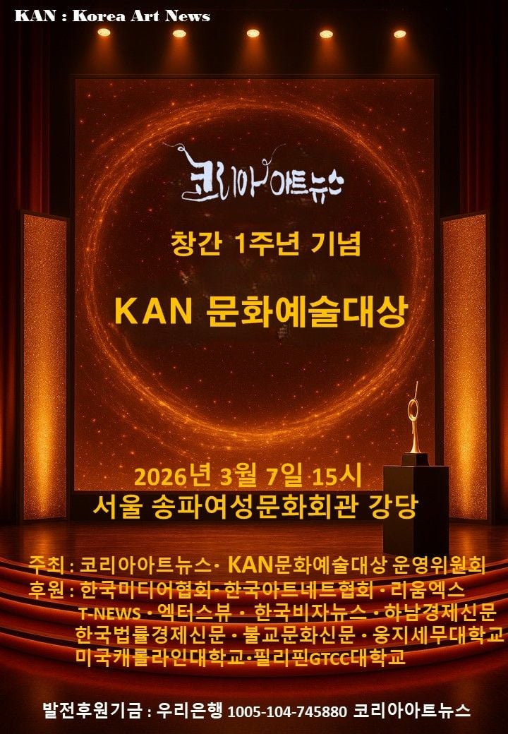 [코리아아트뉴스=편집국] 오는 2026년 3월 3일 창간 1주년을 맞는 코리아아트뉴스가 3월 7일 오후 3시 송파 여성문화회관 강당에서 기념식과 함께 KAN문화예술대상 시상식을 개최한다. 이번 행사는 창간 이후 1년 동안 문화예술계의 다양한 목소리를 담아내며 발전해온 성과를 기념하고, 한국 문화예술의 저변 확대와 창의적 활동을 격려하기 위해 마련됐다.