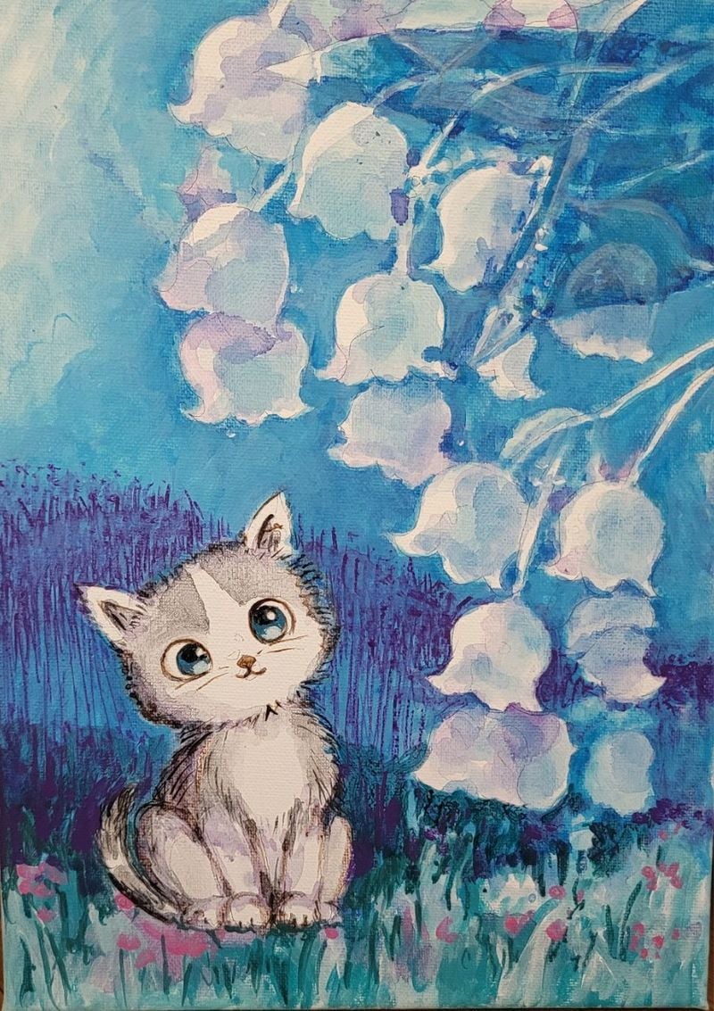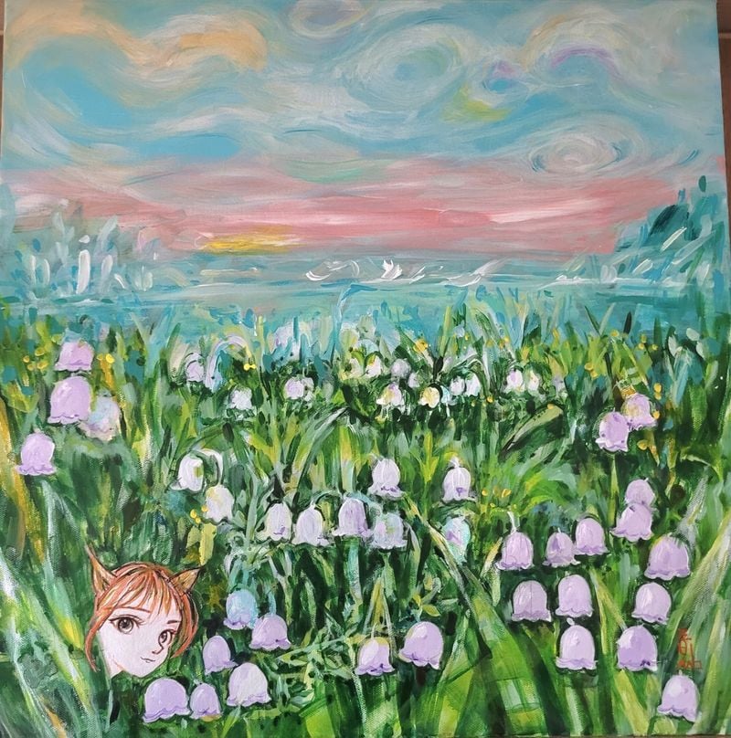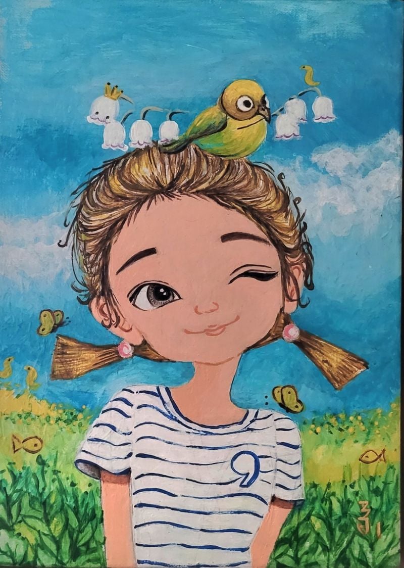 실제 출품작 분위기에서도 이러한 특징은 분명하게 드러난다. 푸른 하늘 아래 소녀와 나비가 교감하는 장면, 은방울꽃이 흐드러진 들판과 달항아리의 고요한 조화, 고양이와 새, 꽃과 작은 상징들이 함께 놓인 화면은 현실의 재현이라기보다 감정의 정원을 닮아 있다. 화면 속 인물과 사물은 서로를 바라보고, 관람자는 다시 그 시선을 응시하게 된다. 그렇게 박삼화 작가의 작품은 ‘보는 그림’에서 머무르지 않고, 감정을 나누는 장면으로 확장된다.