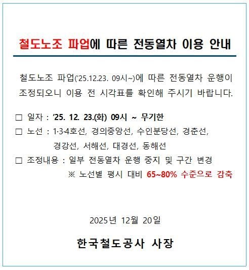 지난 20일, 코레일 홈페이지(한국철도공사) 공고를 통해 일부 전동열차 운행 중지 및 구간 변경 등 '철도노조 파업에 따른 전동열차 이용 안내문' 을 공지했다.